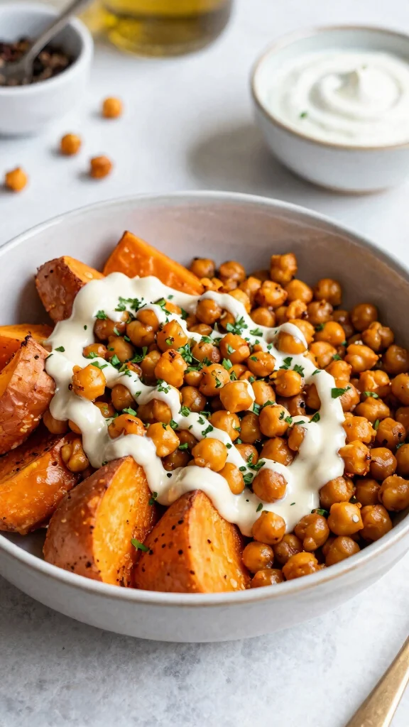 5. Assemble the bowl by combining sweet potatoes and chickpeas, adding tahini or yogurt on top.
