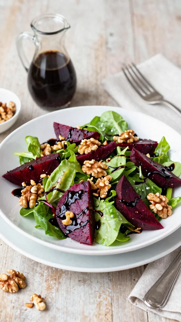 2. In a bowl, mix roasted beets, mixed greens, and walnuts.