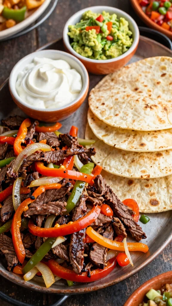 Ingredients: – 1 pound skirt steak, sliced thinly – 2 bell peppers, sliced – 1 onion, sliced – 1 tablespoon fajita seasoning – 8 tortillas – Toppings: sour cream, guacamole, salsa.