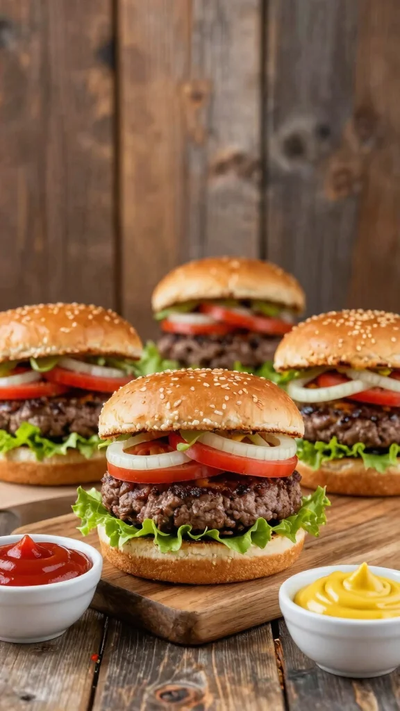 Ingredients: – 1 pound ground beef – 4 hamburger buns – Lettuce, tomato, and onion for toppings – Cheese slices (optional) – Ketchup and mustard for serving.