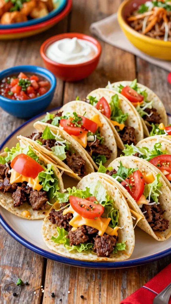 Ingredients: – 1 pound ground beef – 12 mini taco shells – 1 packet taco seasoning – 1 cup shredded lettuce – 1 cup diced tomatoes – 1 cup shredded cheddar cheese – Sour cream and salsa for serving.
