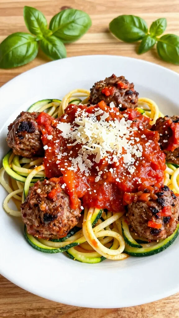 5. Serve zoodles topped with marinara sauce and meatballs, garnished with parmesan if desired.