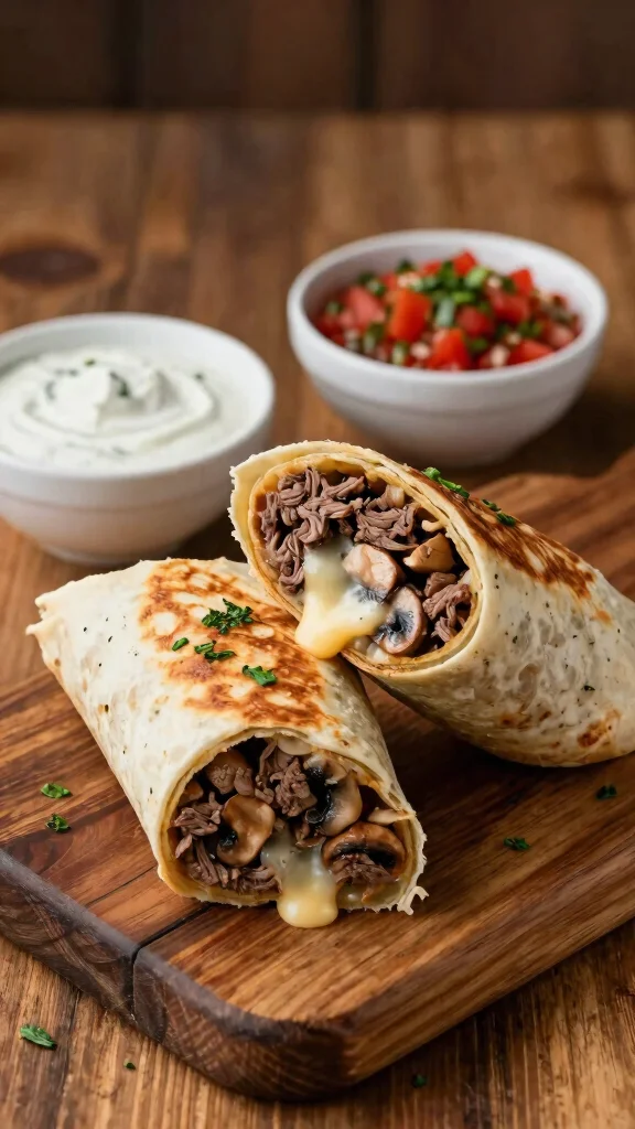 3. Lay tortillas flat, place the beef and mushroom mixture in the center, top with cheese, and roll tightly.