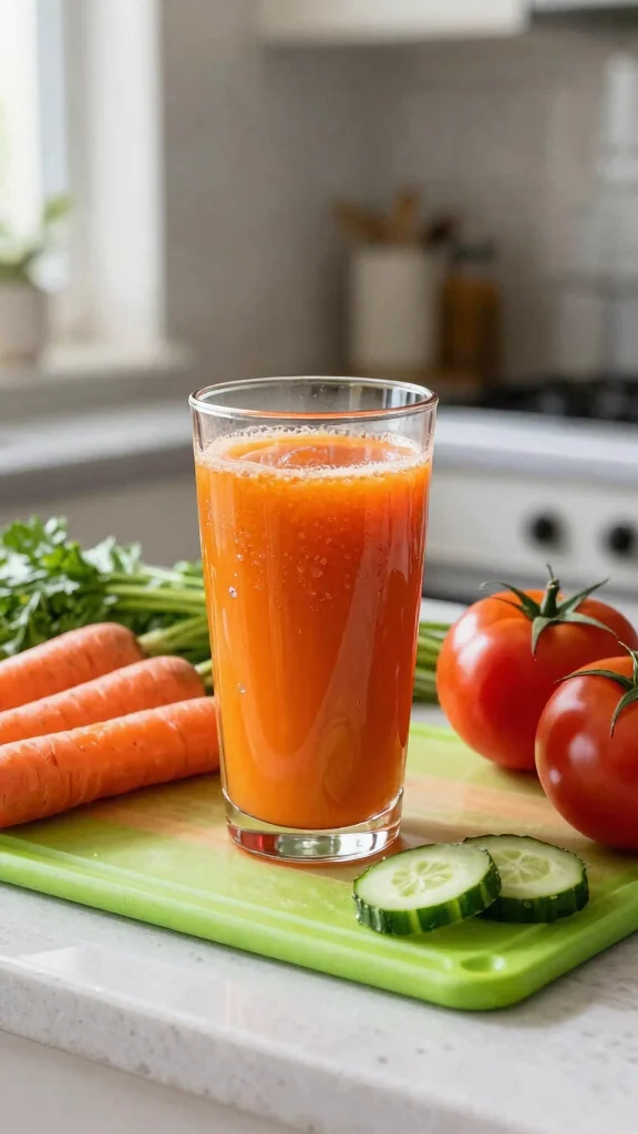 2. In a juicer, combine the carrots, cucumber, tomato, and apple juice.