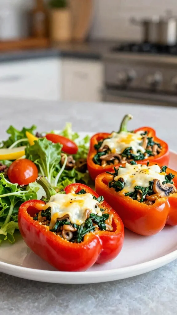 Want to impress your guests? Try these Mushroom and Spinach Stuffed Peppers! They are vibrant, flavorful, and packed with a nutritious filling.